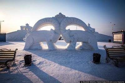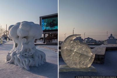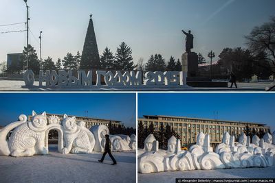 14 Местный Ленин стоит на улице Ленина, возле администрации. Администрация выходит прямо на набережную. Каждый год здесь делают зимний городок с ледовыми скульптурами. Мне понравились коты и ратники Черномора, которые как бы защищают обладминистрацию. От китайцев?